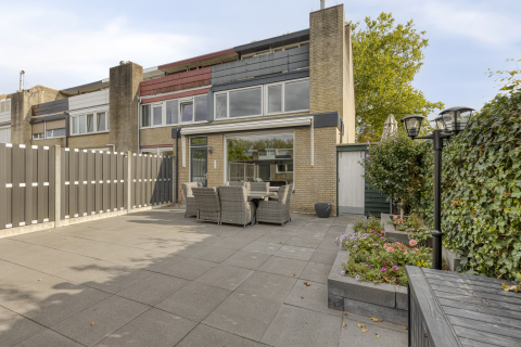 Achterin vind je een ruime stenen berging (ca. 10,5 m²) met elektra, perfect voor het opladen van fietsen, het opbergen van gereedschap of het plaatsen van een extra koelkast of vriezer. Via de poort onder de overkapping naast de berging kom je gemakkelijk in de brandgang – ideaal als je met de fiets thuiskomt.