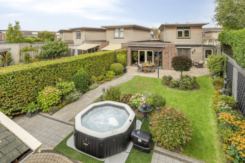 De tuin ligt op het oosten en is verrassend diep (ca. 7,80 m) en breed (ca. 6,27 m). Direct aan het huis ligt een grote overkapping van ruim 18 m² – een heerlijke plek voor een loungehoek én eettafel. Het kunstgras en de borders zorgen voor een fijne, kindvriendelijke sfeer zonder dat je veel onderhoud hebt.