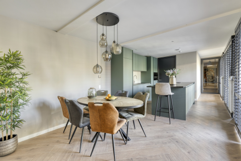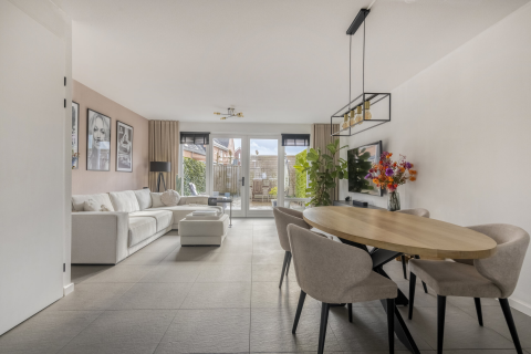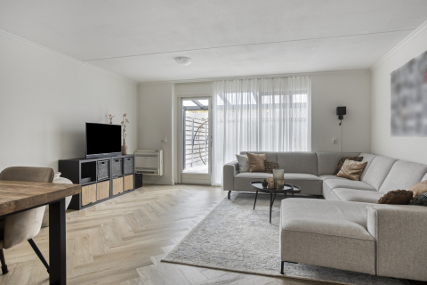 De woonkamer en keuken vormen samen een ruime en lichte leefruimte van ca. 34,2 m². Aan de voorzijde kun je een grote hoekbank en tv-hoek kwijt, en aan de achterzijde is plek voor een eettafel met 6 stoelen, perfect om samen met je gezin te eten of te borrelen met vrienden.